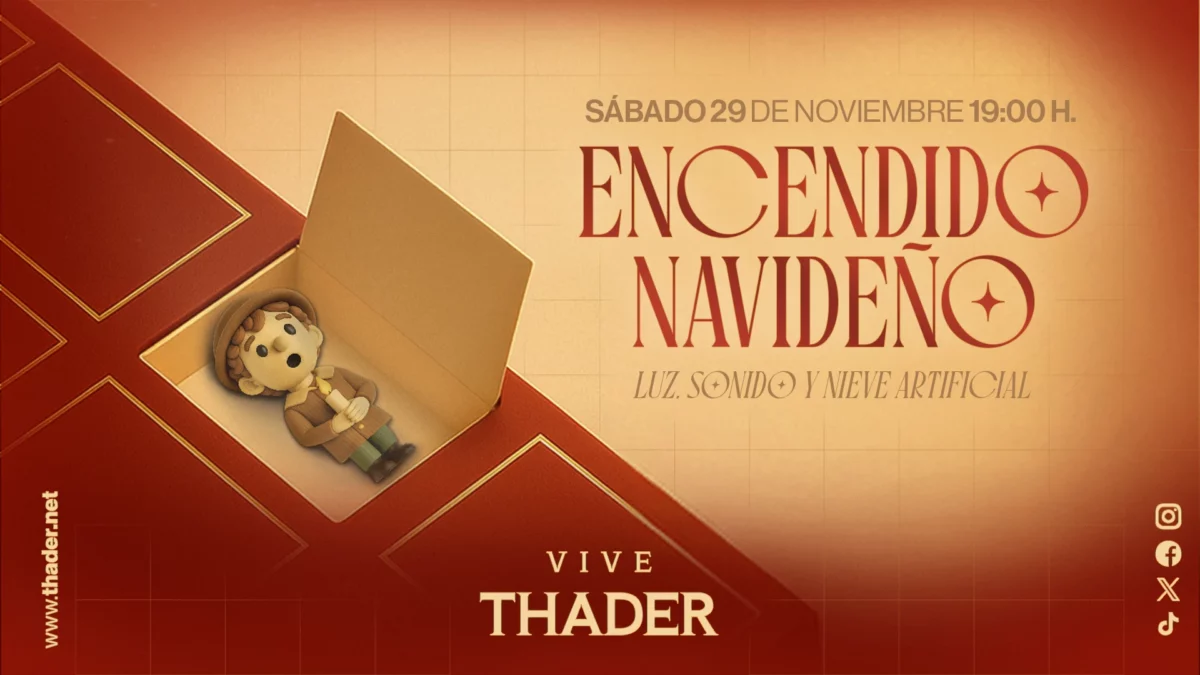 A las 19:00 h, prepárate para vivir la emoción del gran encendido de luces navideñas en Thader. Un espectáculo lleno de ilusión que marcará el inicio de la campaña más esperada del año.