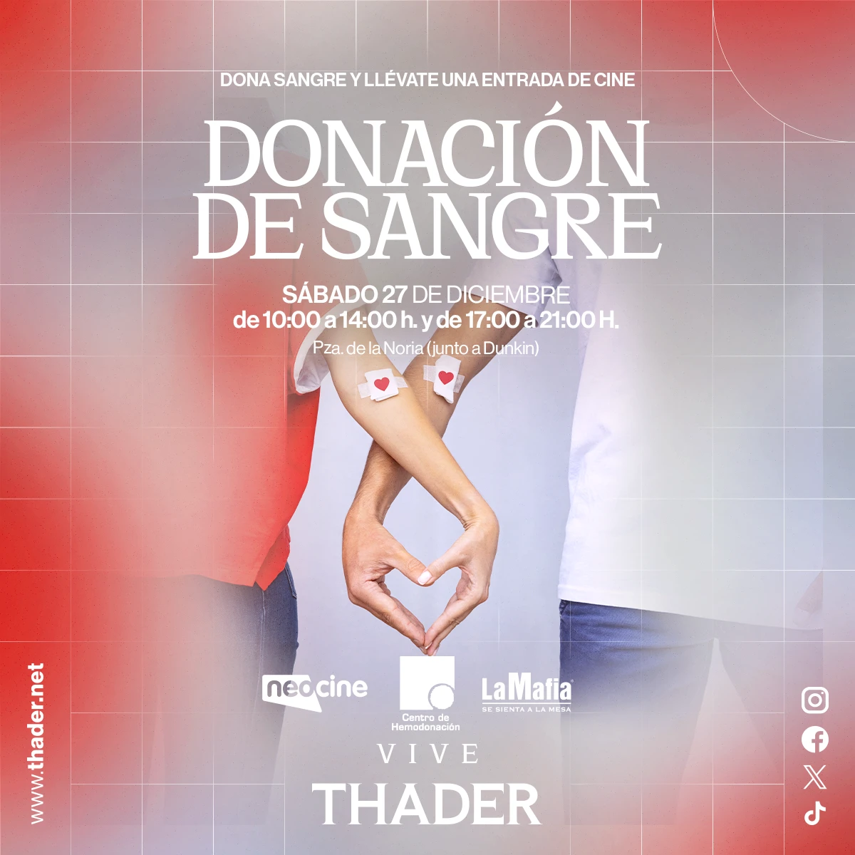 El próximo 27 de diciembre, ven a donar sangre a Thader, junto con el Centro Regional de Hemodonación. Murcia ¡Te esperamos!