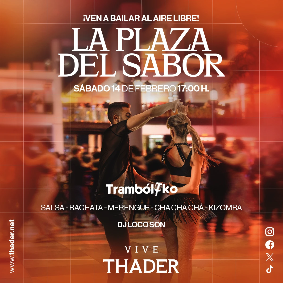 El sábado 14 de febrero, entre las 17:00 y las 21:00 h, la Plaza de la Noria acogerá La Plaza del Sabor, una tarde de baile al aire libre con salsa, bachata, merengue, cha-cha-cha y kizomba, de la mano de Trambóliko, con profesores y animación.